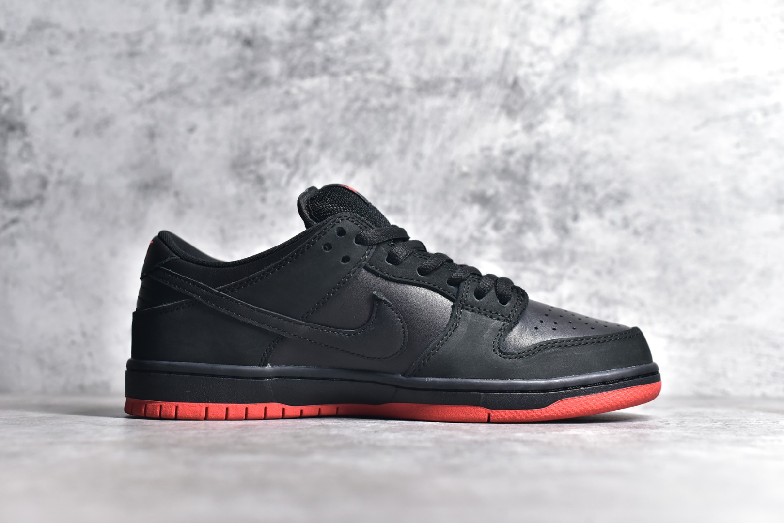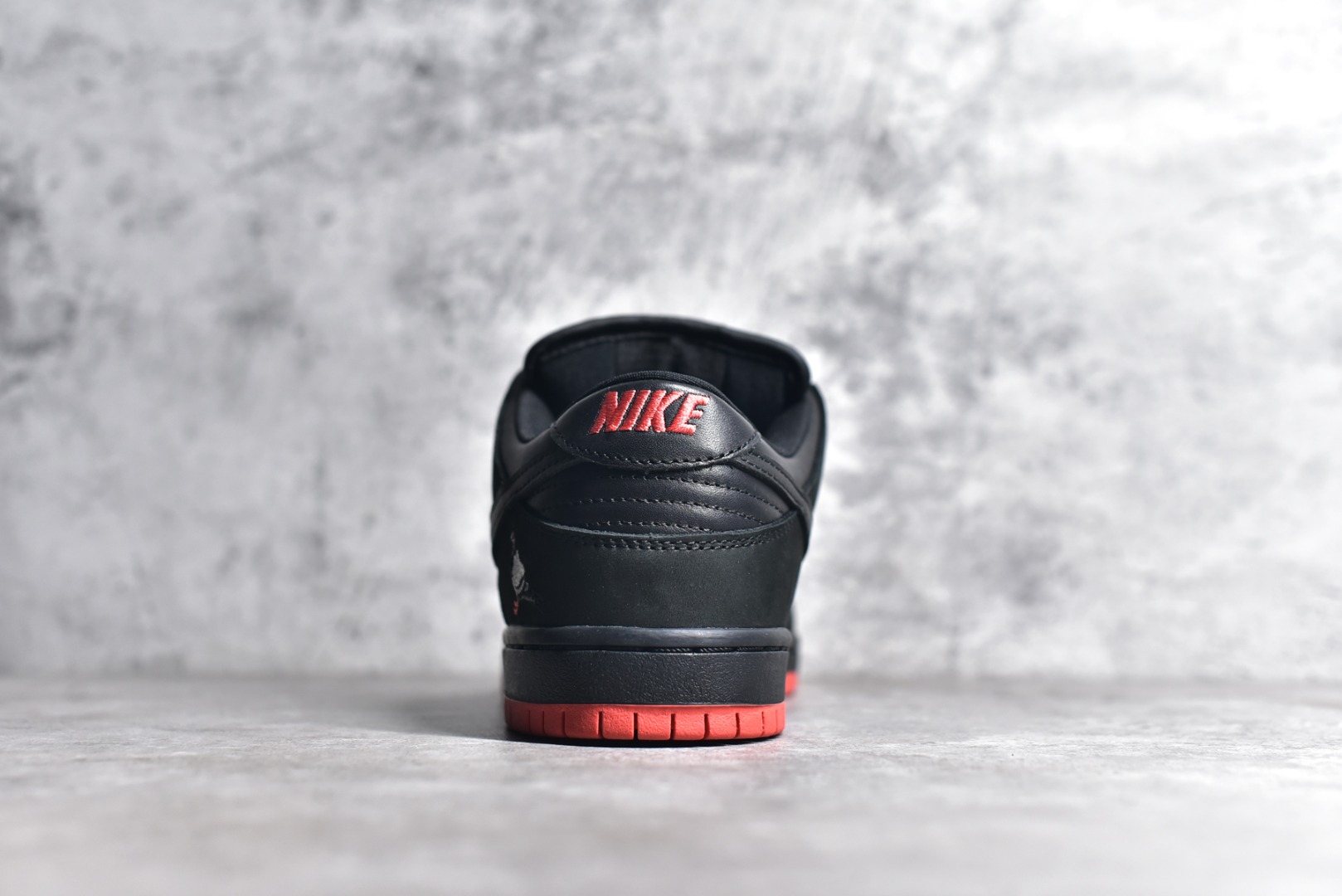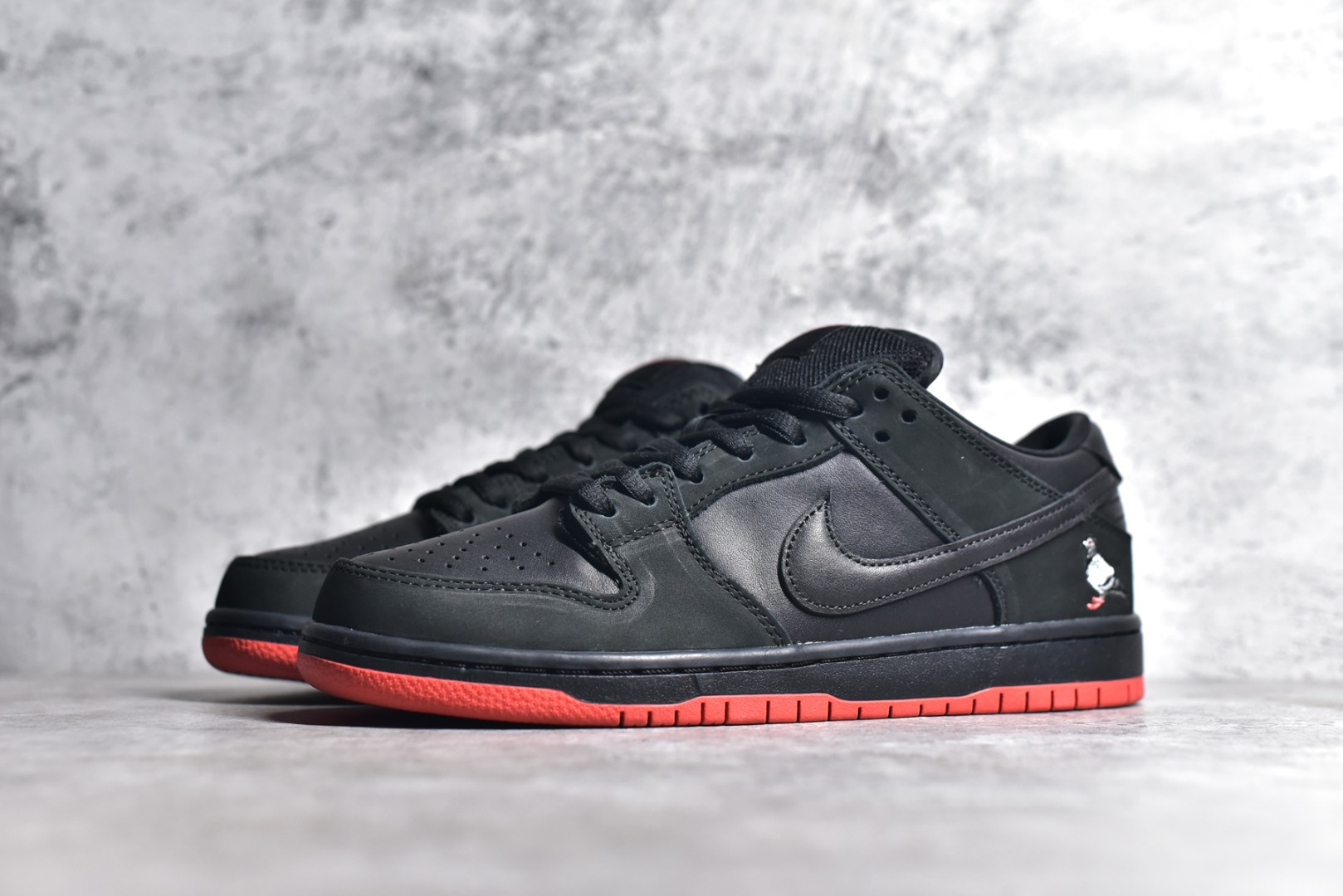 - Premium Materials: Black leather upper with pigeon graphics.